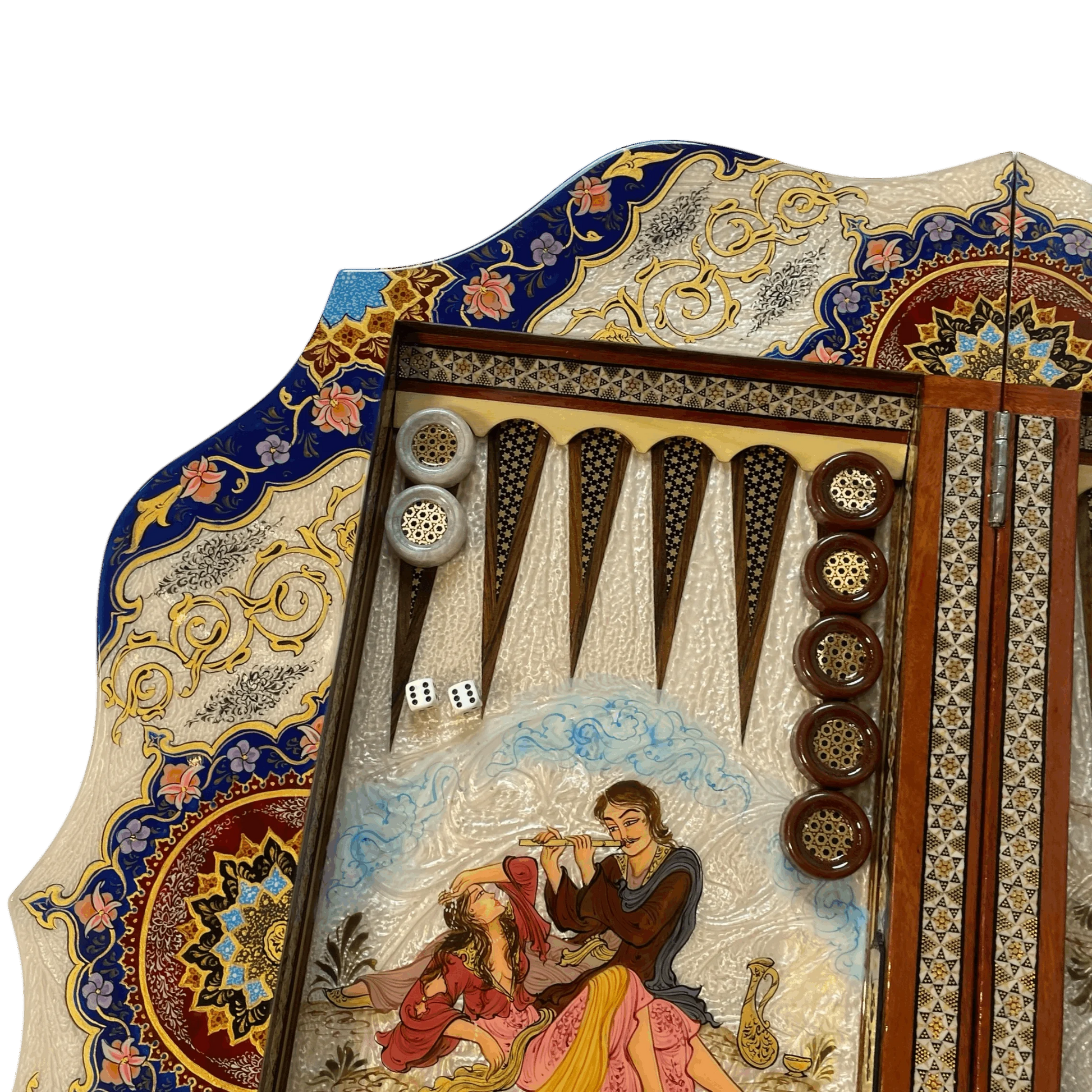 The solar backgammon board is more than just a game tool; it is as if in every move of the piece, one can feel the pulse of Arabian history and art. The combination of solar motifs, romantic miniatures, and the party scene on the back of the work has turned it into a living and lasting painting of Arabian love, joy, and elegance.