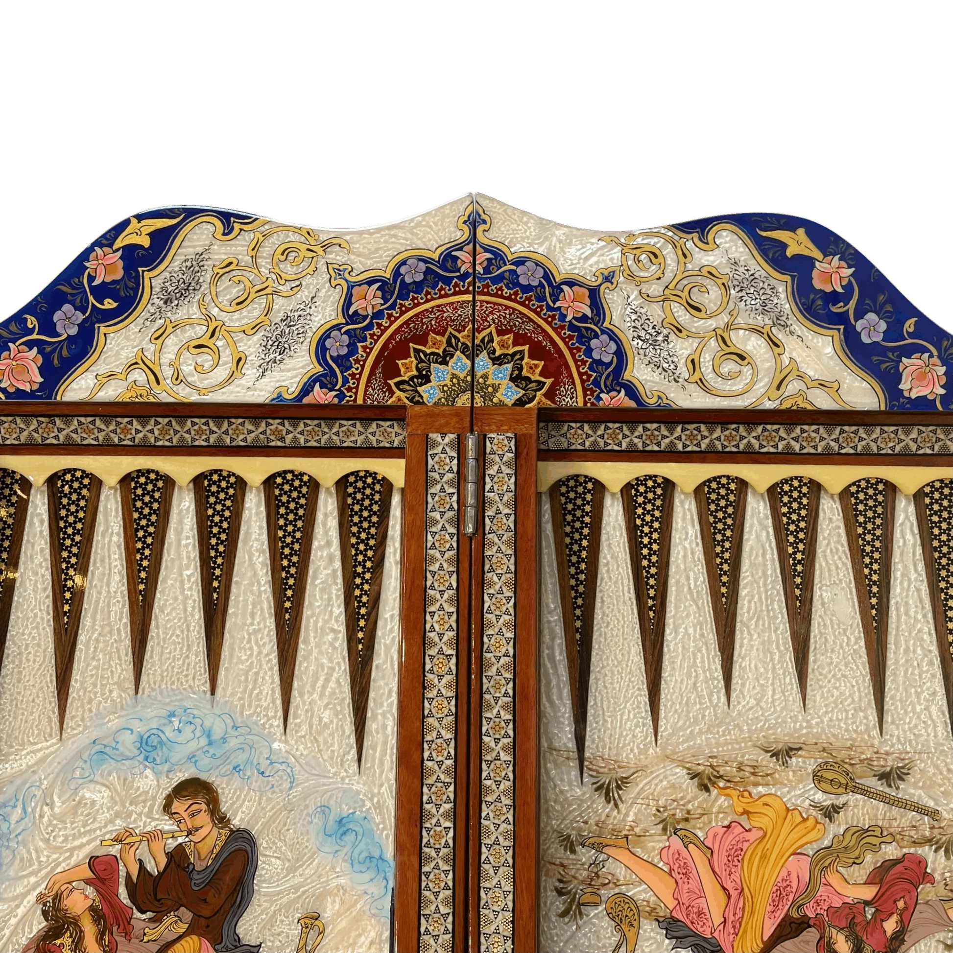 The back of the board is also beautifully decorated with a painting of a Persian feast; a celebration full of color, joy, and elegance that comes to life around the inlaid chessboard.