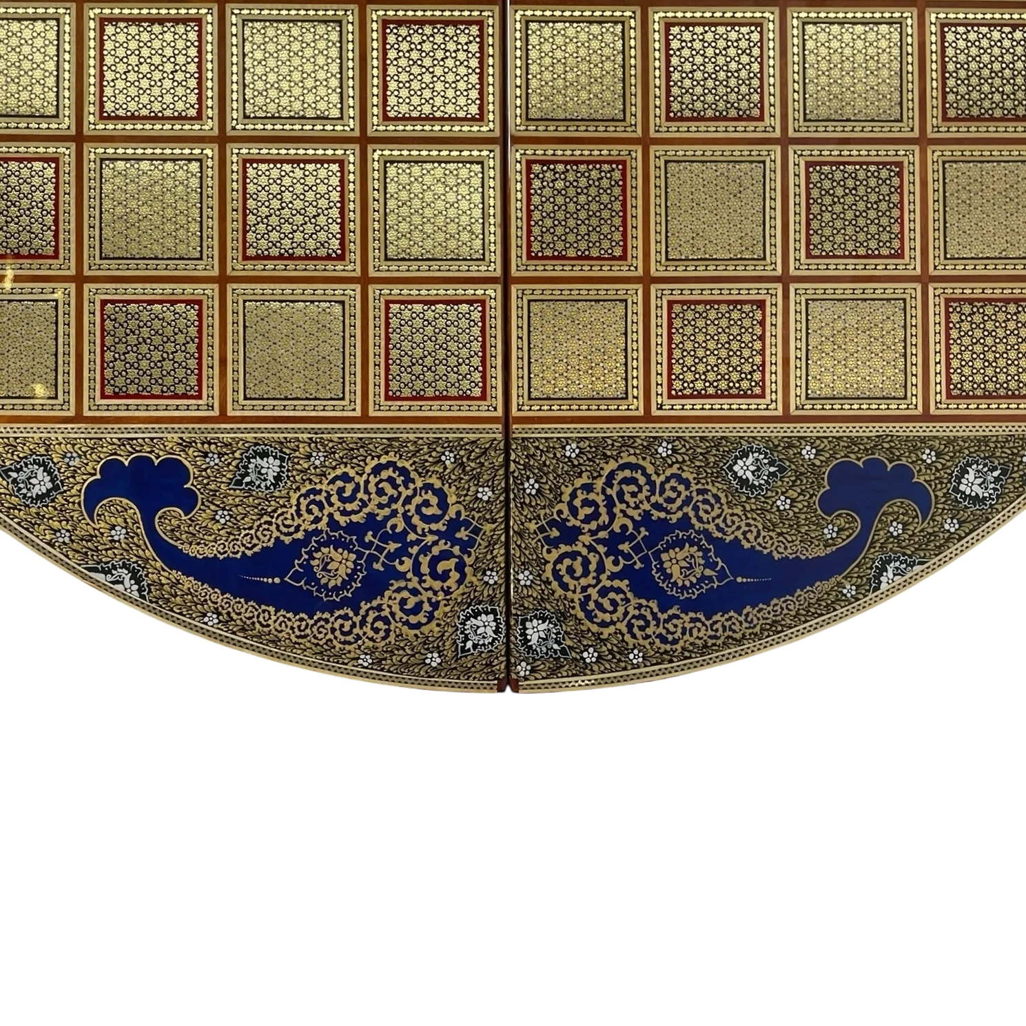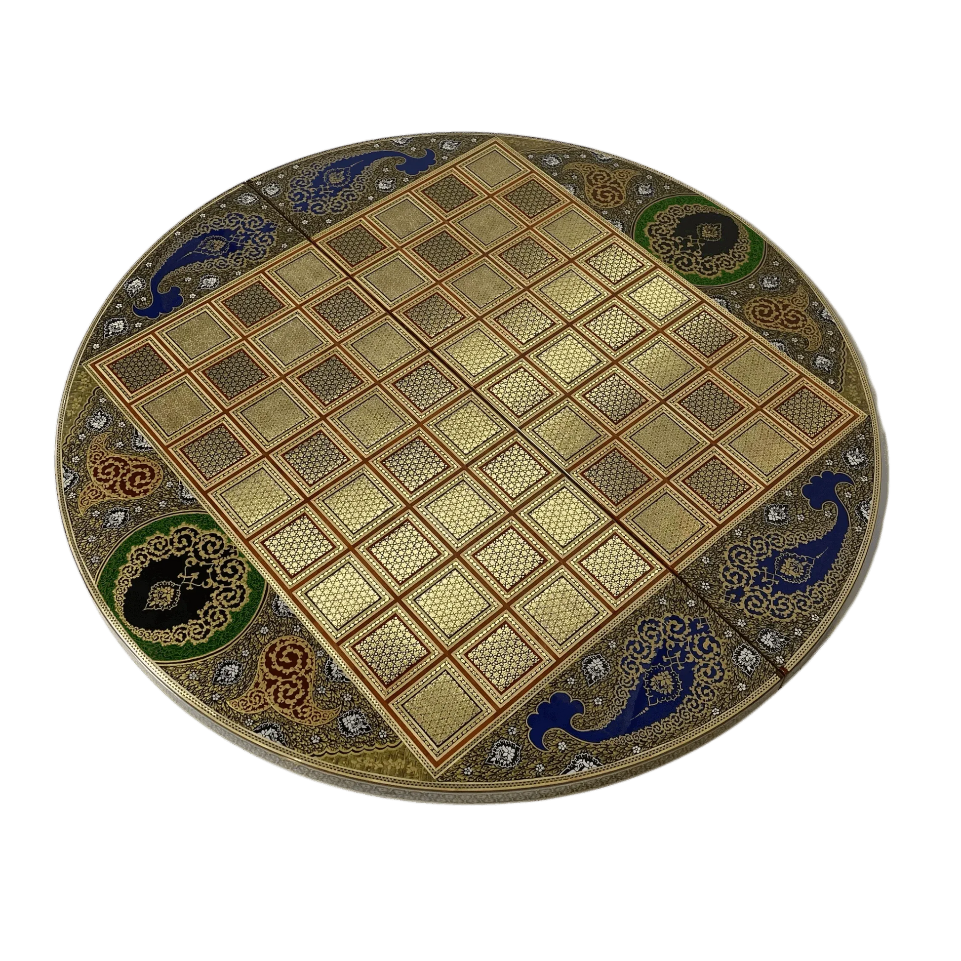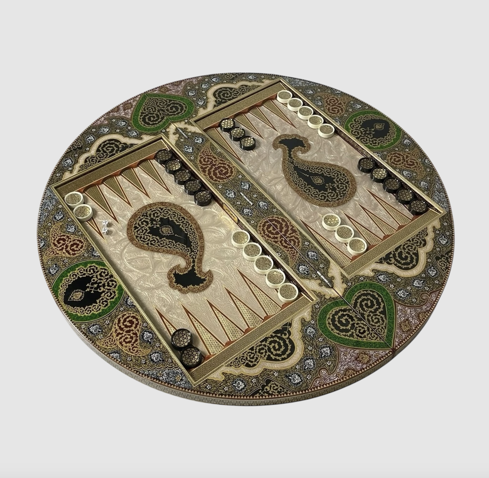 The round backgammon and chess board is a magnificent manifestation of authentic Arabian art; a work that showcases the elegance of craftsmanship and the spirit of traditional art in a luxurious and eye-catching form.